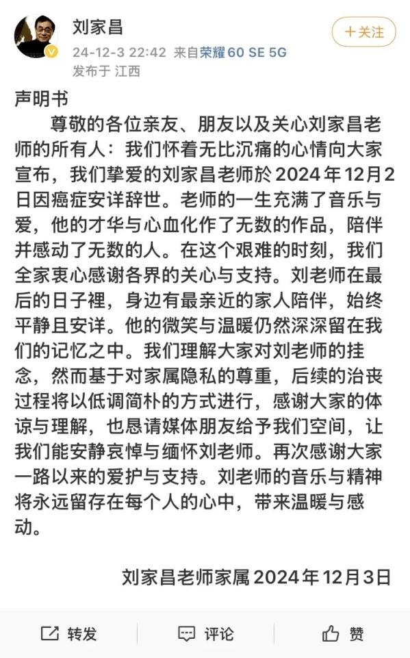 12月3日夜间,著名音乐制作人、词曲作家、歌手刘家昌家人发表声明,证实刘家昌于2日因癌症辞世,享年81岁。数十年间,刘家昌创作了《月满西楼》《往事只能回味》《一帘幽梦》《我是中国人》等知名歌曲,至今传唱不衰。