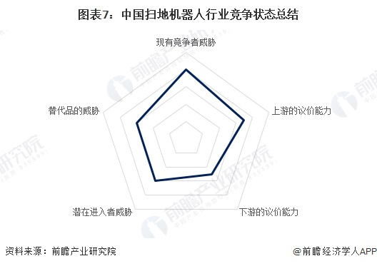 从五力竞争模型角度分析,目前,我国扫地机器人行业供给企业数量一般,行业毛利率较高,具有一定的进入门槛;在下游议价方面,家庭消费是主要业务场景,议价能力较低;扫地机器人发展前景良好,吸引新进入企业参与布局。