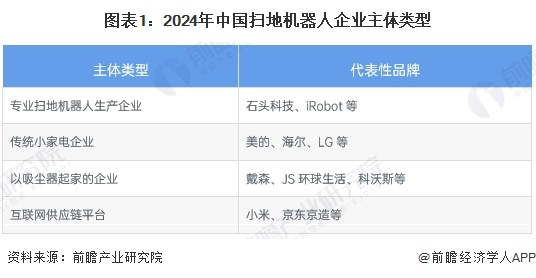 从中国扫地机器人企业主体类型来看,国内扫地机器人市场现阶段主要被四类企业占据:一是专业扫地机器人企业,包括石头科技、iRobot等;二是传统小家电企业,包括美的、海尔、LG等;三是吸尘器起家企业,包括戴森、JS环球生活、科沃斯等;四是依托互联网供应链进入扫地机器人领域的小米、京东京造等企业。