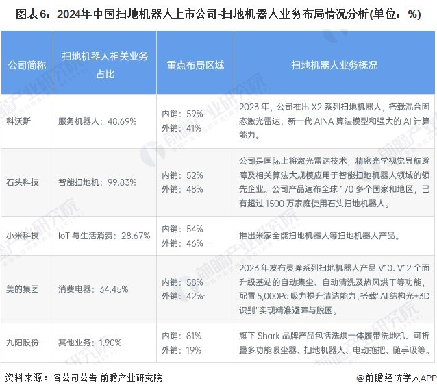 扫地机器人行业的上市公司中,大部分企业全面覆盖国内外市场;同时,从业务占比可以看出,科沃斯和石头科技扫地机器人业务布局力度较大。