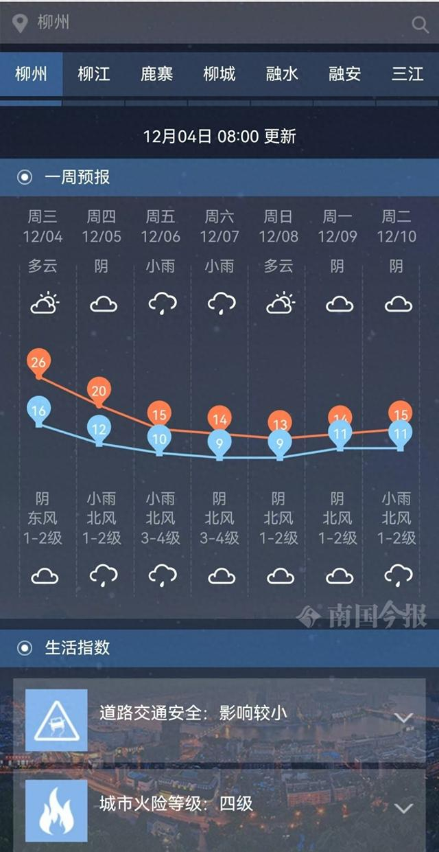 12月4日,柳州市气象台发布天气预报,今天白天,全市多云,局部地区有小雨。但12月5日至6日,受冷空气影响,全市阴天有小雨,局部地区将有中到大雨,风力增大、降温明显,柳州市区最低气温预计将降至个位数。大家的厚被子,明晚要盖起来啦!