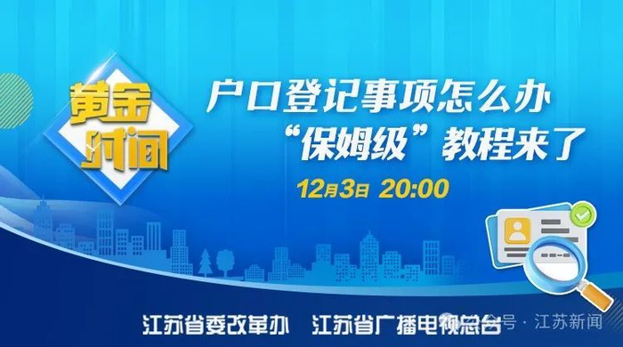 12月3日,江苏省委改革办与江苏广电总台融媒体新闻中心、江苏新闻频道联合策划的全媒体改革政策解读节目《黄金时间—改革政策e解读》关注“户口登记事项怎么办‘保姆级’教程来了”。