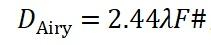 但不幸的是,随着成像分辨率越来越高,以至于和光的波长量级接近的时候,光的波动性开始显现。以至于即使是对于一个理想物点,经过一个没有任何像差的完美透镜成像,也得不到一个理想的几何像点,而一定是一个光斑——这就是艾里斑。艾里斑的直径可以由如下公式表达: