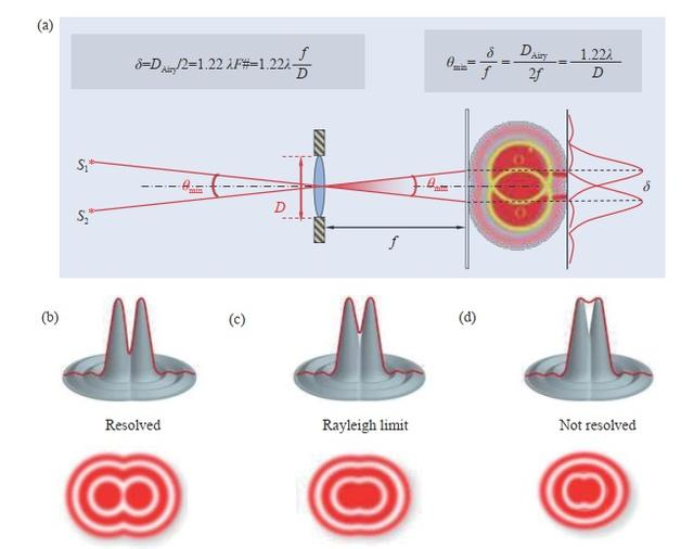 (a) 艾里斑的形成 (b)-(d) 瑞利判据的可视化表达