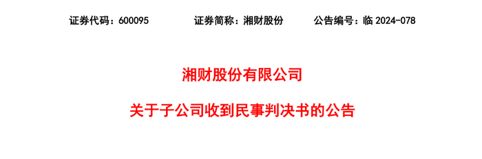 12月3日晚,湘财股份(600095)发布《关于子公司收到民事判决书的公告》。