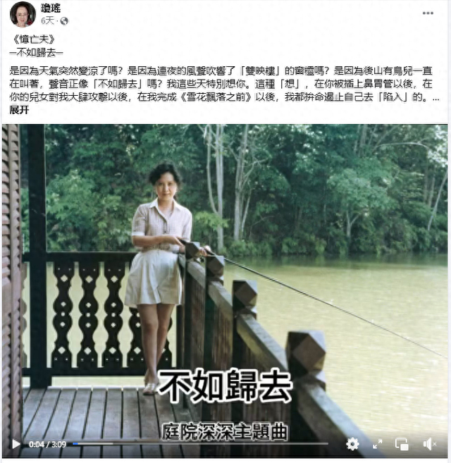 琼瑶数日前回忆亡夫,两次配诗“不如归去”
