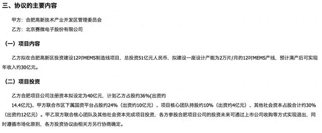 项目投资方面,赛微电子合肥项目公司注册资本拟设定为40亿元,计划赛微电子出资约14.4亿元,占股约36%、合肥高新区管委会联合市区下属国资平台出资约10亿元,占股约24%、项目核心团队出资约4亿元,持股约10%、其他社会资本出资约12亿元,占股合计约30%。