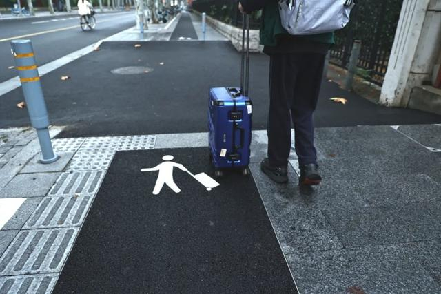 杨浦区建管委以人行道品质提升为契机,梳理了政化路、国权路、国达路等九条路的人行道通行情况,对人行道设施带行道树、箱体杆件等设施进行集约化布设,在国权路人行道上设置了0.6米宽拉杆箱专用道,周边大学师生从地铁站出来后可以沿着一体化铺设平坦的“拉杆箱道”,顺畅地进入校园,方便了节假日、开学季时师生的出行,更避免了个别人图“平坦”而在非机动车道上拖行李箱的危险行为。