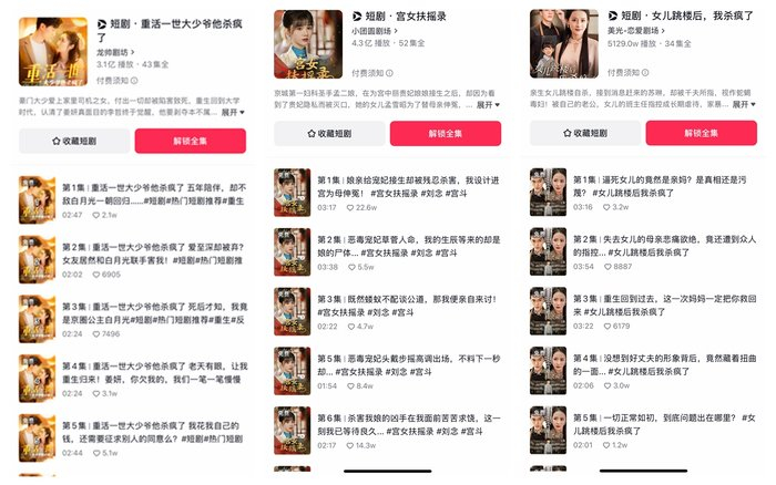 前述热门微短剧《重活一世,大少爷他杀疯了》即是一例。剧中原本的集团继承人衣衫褴褛地从救助站出来,才知道是自己喜欢的人陷害自己、抢走公司,还害得自己感染艾滋。这部微短剧共43集,单集时长2-3分钟,第三集主角就病发死去,然后重生回到学生时期,开始复仇。类似的微短剧还有《重生九零少爷杀疯了》《逆袭之我和重生男主暴虐渣渣》等等。