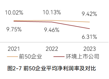 在净利润率方面,前50企业平均净利润率9.42%,较去年降低约0.7个百分点;前50企业平均净利润率大幅高出环境上市公司平均净利润率(6.31%)。(图2-7)