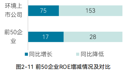 前50企业中,净资产回报率同比增长的17 家,同比下降的28家,分别占比37.78%和62.22%,而环境上市公司数据分别为32.89%和67.11%。(图2-11)