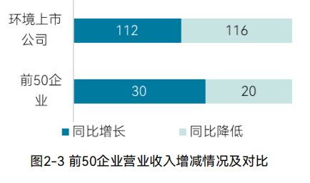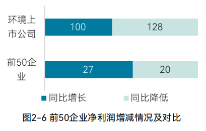 前50企业净利润同比增长的27家,同比下降的20家,分别占比57.45%和42.55%,而环境上市公司数据分别为43.86%和56.14%,前50企业表现仍优于环境上市公司。(图2-6)