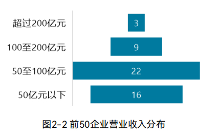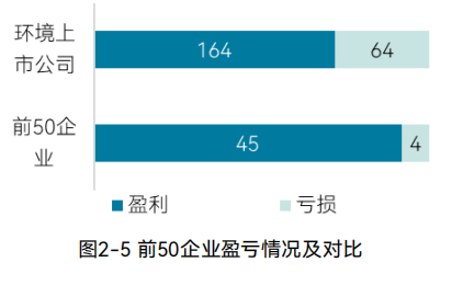 前50企业中,盈利的45家、占比91.84%,亏损的4家、占比8.16%;而环境上市公司盈利企业占比71.93%,亏损企业占比28.07%。(图2-5)