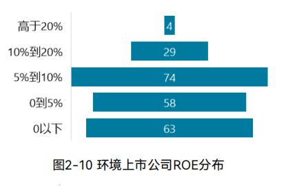 环境上市公司中,净资产回报率高于20%的4家,占比1.75%,10%至20%的29家,占比12.72%;5%至10%的74家,占比32.46%;0至5%的58家,占比25.44%;净资产回报率为负的63家,占比27.63%。(图2-10)