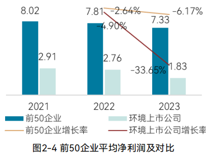 2024年度前50企业平均净利润较2023年度前50企业增长29.03%;2024年度前50企业平均净利润是环境上市公司的3.99倍,较2023年度的2.82倍大幅提高;也大幅高于2023年度前50企业平均净利润是环境上市公司的2.16倍这一数值。