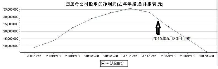 首华燃气原名沃施股份,主要从事园艺用品的研发、生产和销售(如割草机、剪刀、铲子、花架、喷水器等),2015年6月30日在创业板上市。上市前净利润徘徊在3000万左右,上市后逐年下滑,2017年仅实现净利润581万元: