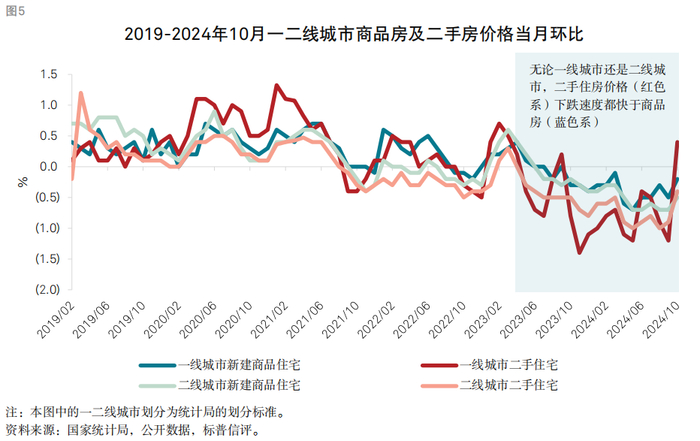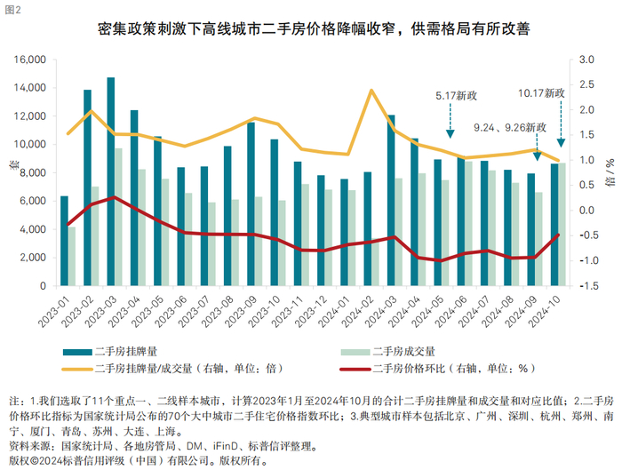 二手房价格企稳是商品房销售的重要前提。随着政策的密集出台,部分城市市场供需格局出现了扭转信号,利好高线城市市场的企稳回归。在2021年开始的房地产下跌周期中,二手房价格跌幅远超新房,削弱了后者的竞争力。我们认为,二手房价格的止跌将是新房销售企稳的重要先导指标。随着近几个月政策的密集落地,部分高线城市二手房价格出现反弹,我们认为这表明市场距离平衡及结构性改善更近了一步。