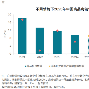 我们预计,100万套货币化安置政策的逐步落地将有助于扭转一二线城市商品房销售的跌势。随着这些政策开始实施,安置需求将在1至2年内逐步转化为商品房签约。按照新购房屋80-100平方米匡算,预计2025年至2026年间将平均释放4000万至5000万平方米的购房需求。我们预计,这些货币化安置项目主要集中在一二线城市,届时释放的交易面积将占2024年这些城市商品房销售面积的10%左右,显著提振新建商品房销售。未来,城中村改造将采用货币化安置的方式推进,并可获得地方政府专项债券以及开发性、政策性金融机构提供的专项贷款等资金支持。我们认为,这项政策将为房地产市场注入增量资金,成为2025年支撑全国房地产市场稳定发展的关键因素。