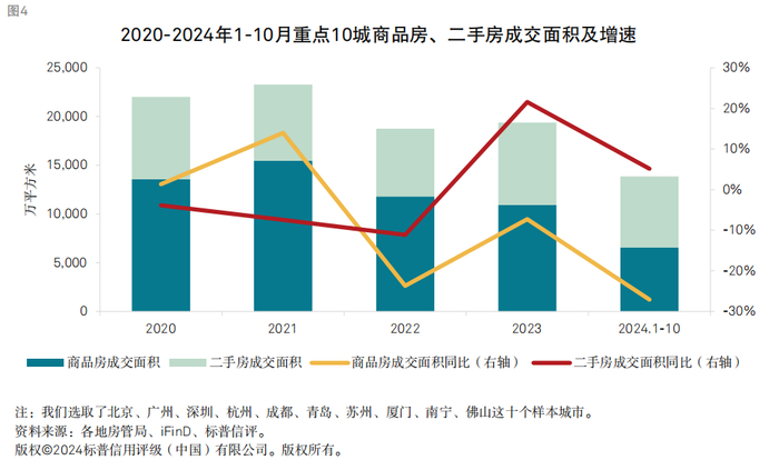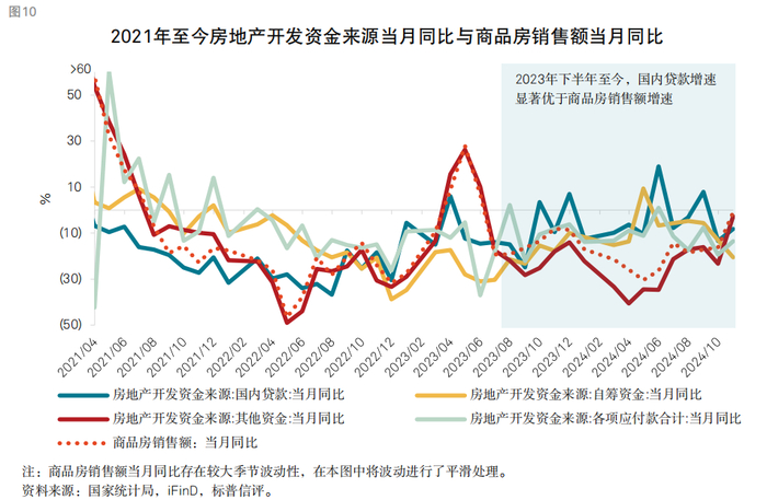 今年以来,金融机构一方面积极支持存量融资合理展期,另一方面也在积极落地新增信贷投放工作。我们观察到,2024年以来,房地产开发企业资金来源中的国内贷款走出了和商品房销售额增速分化的行情。截至2024年10月,来自于国内贷款的开发资金规模累计同比下降了6.4%,显著低于定金、预收款等资金来源25%-30%的下降幅度。我们认为,在商品房销售快速下降的情况下,开发贷仍能保持相对高的规模,主要是由于“白名单”和“保交付”政策的推动。