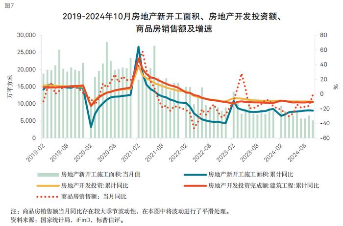 我们预计,新开工面积将维持低迷,但“保交楼”和“白名单”仍将是建安投资的主要支撑力,因此房地产行业的建安投资将在2024年基础上再下降5%至10%,降幅边际收窄。在销售、拿地等先行指标并未改善的背景下,我们认为2025年新开工面积难有起色。较大的库存压力、持续的销售下行压力仍将抑制新开工面积的增长,令其维持两位数跌幅。但在“白名单”扩容等融资政策的支撑下,“保交楼”项目将继续发力,对建安工程的施工强度构成一定正面支撑。得益于此,我们预计2025年房地产开发行业的建安投资支出降幅将边际收窄。数据显示,2024年1-10月,尽管销售持续承压,但房地产建筑投资完成额的表现优于销售表现,显示出政策推动的效果。