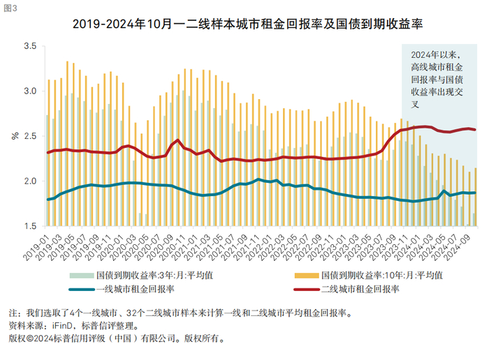 我们预计,一二线城市商品房价格仍将在现有基础上跌去5%-8%,并在2026年逐步企稳。这主要是由于我们相信销售额企稳并不意味着市场供需平衡的达成。我们认为,2025年高线城市销售面积的增长预期来源于货币化安置等政策的托举,并不能完全转化为市场内在供需关系的平衡。因此我们预计,从二手房挂牌量企稳到二手房价格企稳,再传导至新房市场价格企稳仍需一定时间。但是房地产作为一个兼具投资属性和自住属性的产品,其价值也受到租金回报与持有的机会成本影响。随着利率的不断下降、房价下跌带来的租金回报率提升,一二线城市房屋的“性价比”正在逐步回归。在美联储降息预期下,中国利率还有下降空间,我们预计,未来一二线城市房价再出现前几年大幅下跌状况的可能性相对较低。
