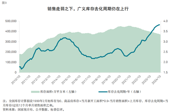 低线城市库存高企使得当地房价企稳困难。当前全国广义库存压力高企,特别是低能级城市的去库存难度不容小觑。据我们测算,2024年10月,中国广义的库存去化周期已从2023年年底的3.5年,上涨到了3.8年,而且还在持续走高。同时,低线城市本身就存在需求不足问题,高线城市限购放松带动交易活跃度提升,对于低线城市可能存在一定虹吸作用。在这种情况下,即使有地产新政出台,低线城市的需求也难以得到显著提振。