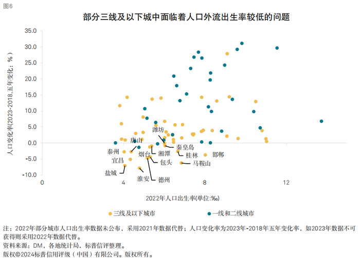 从需求基本面来看,三线及以下城市的人口和产业基本面薄弱,限制了购房需求并增加了市场观望情绪。我国人口持续向主要大城市集聚,三线及以下城市存在人口下滑的隐忧。在我们研究的58个低线样本城市中,近30%的城市出现人口外流,而一二线城市则很少出现这种现象。人口外流不仅意味着潜在需求减少,也会加重市场上的观望情绪,使得房地产市场的活跃度难以被激发,市场交易及其对政策的反应会相对冷淡。
