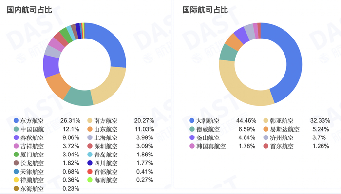 根据航班管家的统计,截至今年11月,国内共有近20家航司执飞中韩航线,其中市场份额占比最大的是中国东航(600115.SH),其次是国航(601111.SH)和春秋航空(601021.SH)。韩国航司共有6家航司执飞中韩航线,其中份额最大的是大韩航空,其次是韩亚航空。
