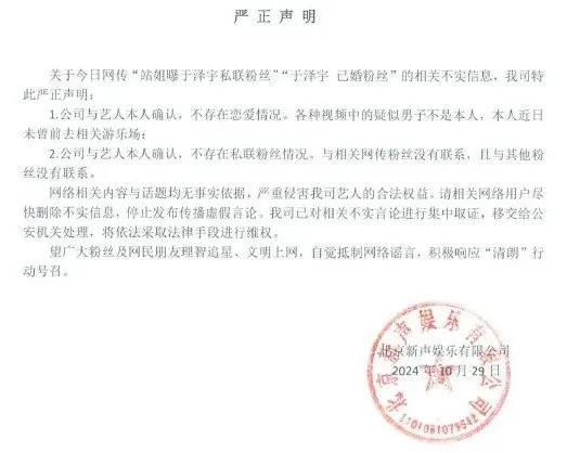 “公司与艺人确认:不存在恋爱情况,于泽宇未曾前去相关游乐场;不存在私联粉丝情况。”