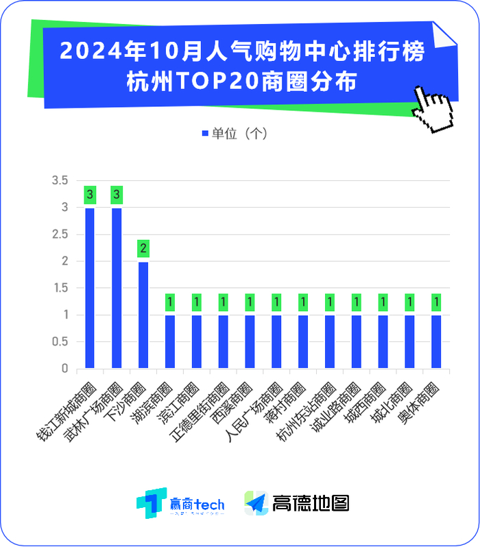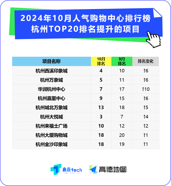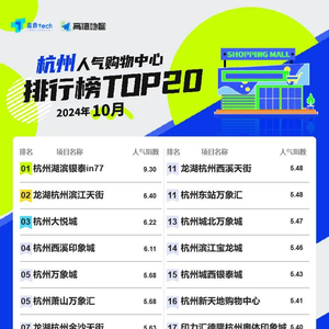 相较9月,《10月人气购物中心排行榜》杭州TOP20项目有所变动,具体的“人气指数”有升有降,对应的商圈分布亦有新章。