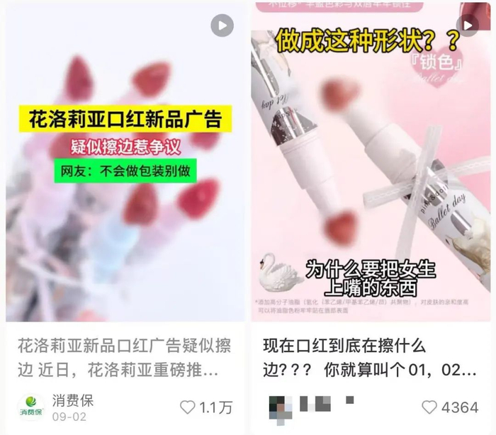 今年9月,有博主发文称:“花洛莉亚新款唇蜜设计和宣传片被指擦边,色号取名也被网友吐槽了。”随后,#花洛莉亚擦边#等话题冲上热搜。