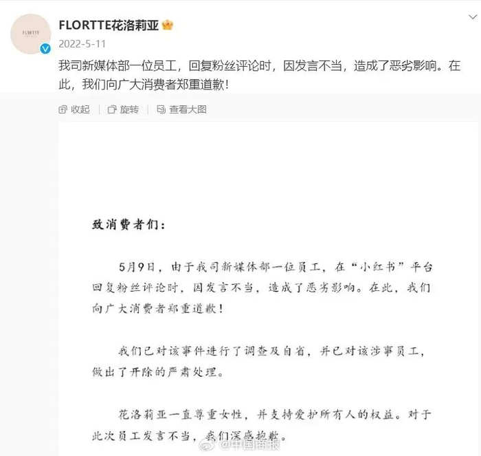 2022年5月,花洛莉亚在社交平台发布卧蚕笔新品预告时配文称“这也太细了吧”。在评论区有网友进行不当评论后,该官方账号回复该评论“啊这是可以说的吗”。相关言论引发质疑,有网友留言认为,“作为女生真的有感觉到不尊重”。公司随后发布致歉声明,并对涉事员工进行了开除处理。