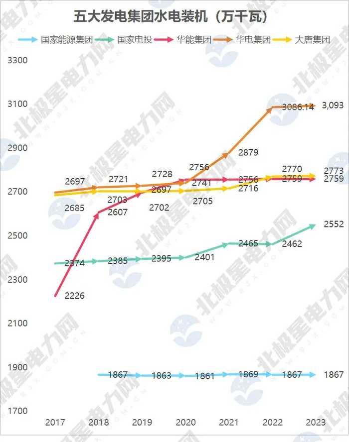 水电装机方面,华电集团在2021-2022年有显著增长,在五大发电之中水电装机第一个突破3000万千瓦大关;国家电投的水电装机在2023年也有小幅增长。