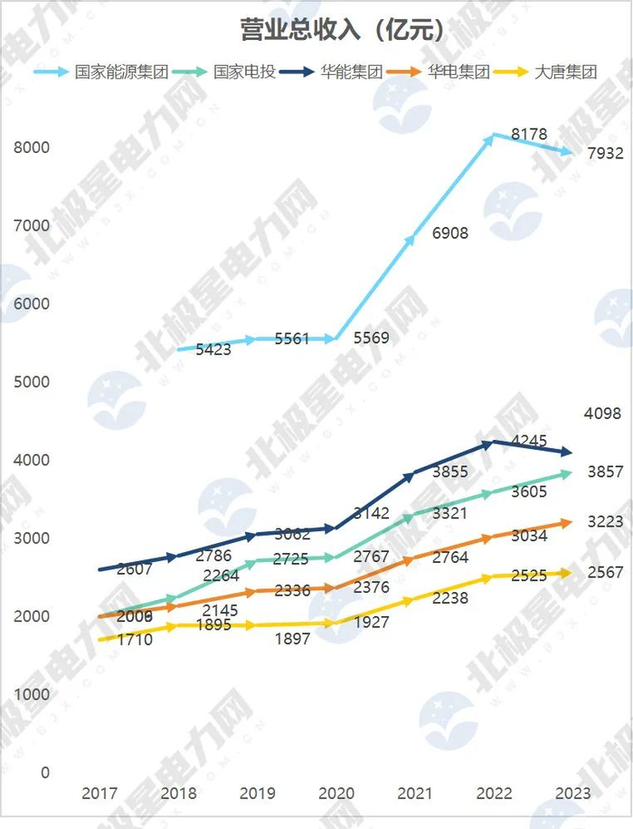 2023年,营业总收入,五大发电位次没有变动。