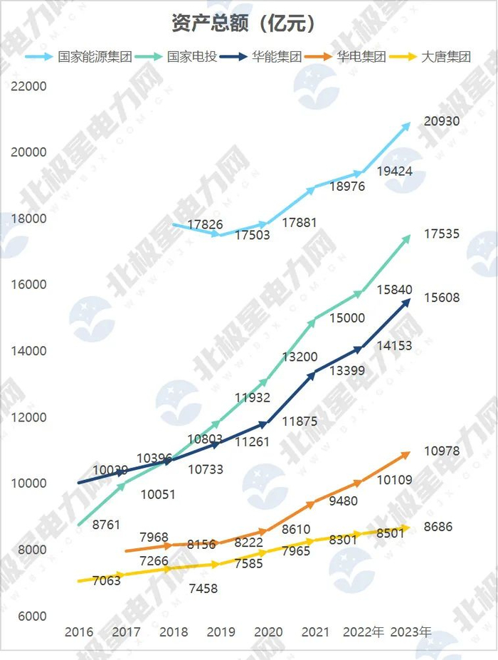 2023年,资产总额方面,国家能源集团依旧排在首位。值得注意的是,国家电投往年的资产增速不容小觑!2023年,国家电投资产总额新增约1695亿元,国家能源集团、华能集团则分别新增1506亿元、1455亿元。