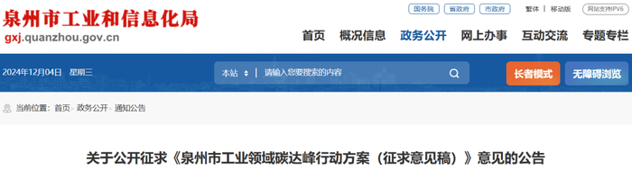 储能与电力市场获悉,近日,泉州市工业和信息化局发布关于公开征求《泉州市工业领域碳达峰行动方案(征求意见稿)》意见的公告。
