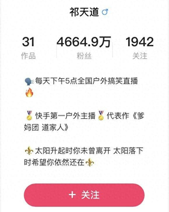 快手平台,祁天道共有4664万粉丝,自称“快手第一户外主播”。其快手主页的“天选企业店”总销量达到1168万件,预估总销售额上亿。