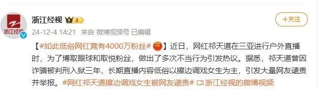 据悉,祁天道曾因诈骗被判刑入狱三年,长期直播内容低俗,以擦边调戏女生为主,引发大量网友谴责并举报。