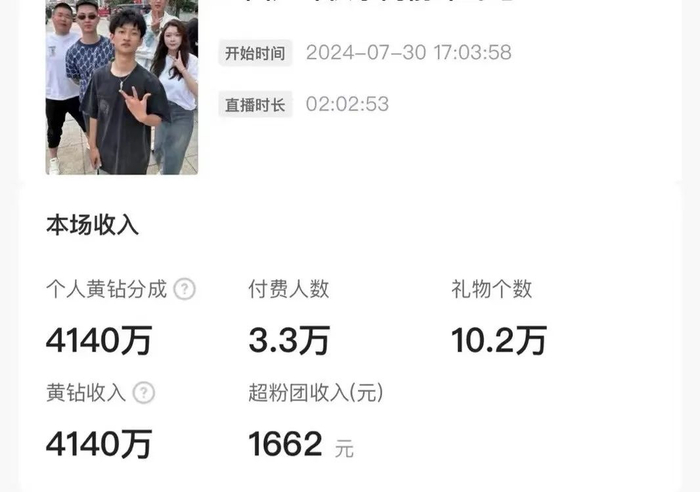 此外,据祁天道公开的直播收入截图显示,其在7月30日的单场直播收获3亿次点赞、10.2万件礼物,个人黄钻收入达到4140万。据快手官方客服,目前兑换比例为200黄钻=1快币=0.1元,以此估算,祁天道单场直播礼物收入约为2万元。