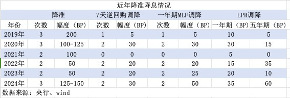 降息方面,今年7天逆回购利率下调30BP,此前几年只有处于疫情冲击之中的2020年才下调30BP;一年期LPR、五年期LPR分别下调35BP、60BP,其中五年期LPR下调幅度和2020年-2023年累计下调幅度相当。