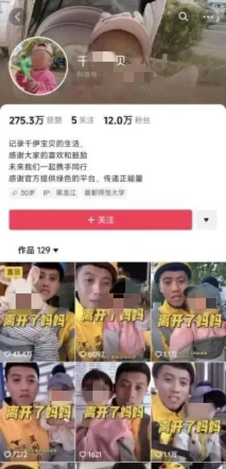 “最后一单结束了,我俩今天一共跑了43单,赚了300多元,今天还是很顺利的。不小心给孩子脸磕到了,还疼不疼了,姑娘告诉爸爸。刷到视频的哥哥姐姐叔叔阿姨给我们点点赞。”视频中,抱着孩子的外卖骑手父亲“小松”正讲述着“悲惨”的故事。评论区来自网友的关心和高达43万的点赞使他充满“创作热情”。“小松”已经在各类平台发布了百余条短视频,个人主页中充满了“离开了妈妈”等字样。靠着发布自己和女儿一起送外卖的视频,“小松”已经在各类网络平台积累了40余万粉丝,也在直播带货中取得了收益。