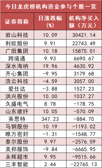 盘后龙虎榜数据显示,机构现身多股,其中,岩山科技等股票呈现机构资金净买入,三丰智能等股票呈现机构资金净卖出。