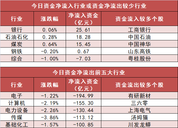 申万一级行业中,4个行业实现资金净流入,其中,银行业净流入25.61亿元居首。