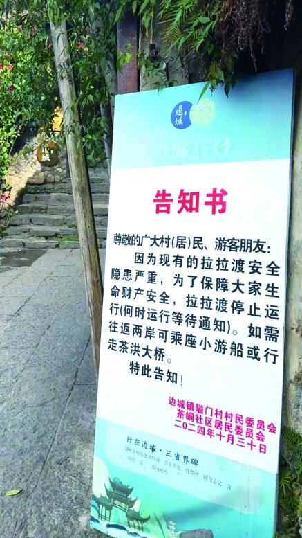 在网友提供的截图中,记者看到这样的提示牌:因为现有拉拉渡安全隐患严重,为了保障大家的生命财产安全,拉拉渡停止运行(何时运行等待通知)。如需往返两岸可乘坐小游船或行走茶洪大桥,落款为湖南边城镇隘门村村民委员会和茶峒社区居民委员会,时间是2024年10月30日。
