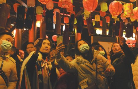2023年1月22日,春节假期,游客在南充市蓬安县相如故城猜灯谜。新华社发