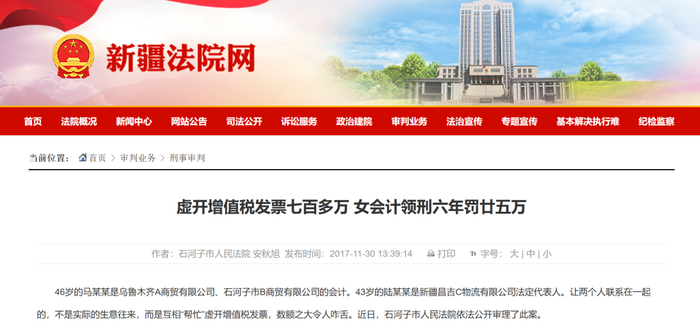 46岁的马某某是乌鲁木齐A商贸有限公司、石河子市B商贸有限公司的会计。43岁的陆某某是新疆昌吉C物流有限公司法定代表人。让两个人联系在一起的,不是实际的生意往来,而是互相“帮忙”虚开增值税发票,数额之大令人咋舌。近日,石河子市人民法院依法公开审理了此案。