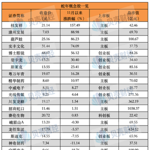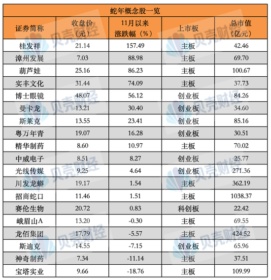 贝壳财经记者根据公开资料不完全统计看到,截至目前,市场认为符合蛇年生肖概念的股票在20只左右,9家公司11月以来涨幅达到两位数以上,而谐音梗、地理梗、俚语梗夹杂其中。其中,字面上带蛇和蟒的上市公司有招商蛇口,龙柏集团(曾用名“龙蟒佰利”)、川发龙蟒,英文“Snake”音译谐音的有斯莱克、斯迪克。