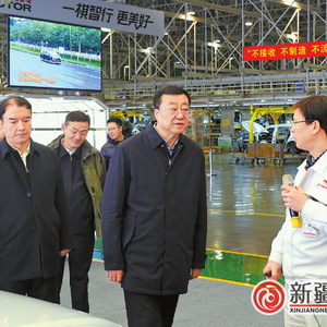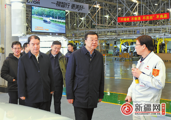 12月4日下午,自治区党委副书记、市委书记张柱在经开区(头屯河区)调研并主持召开座谈会,研究推进经开区(头屯河区)工作。图为会前,在广汽传祺汽车有限公司新疆分公司生产车间,张柱详细了解企业生产经营、质量管理、智能制造等情况。(全媒体记者陈星宇摄)