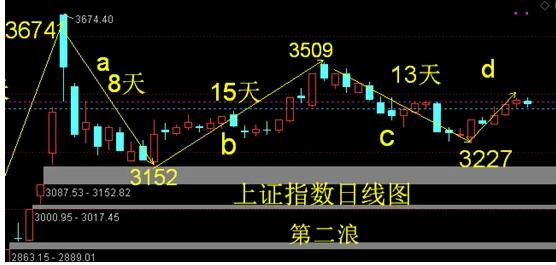 从大的形态看,第二浪是双底结构:3152和3227点构筑双底,颈线位是3509点,只有突破3509点才能正式吹响第三浪行情。