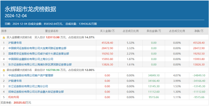 另外,在多路游资积极豪买的同时,12月4日也有部分资金已经在逃离该股,其中,一线游资常用席位长江证券上海分公司以1.31亿元的卖出额出现在永辉超市卖方第三位,还有一个机构专用席位也卖出该股9515.66万元。